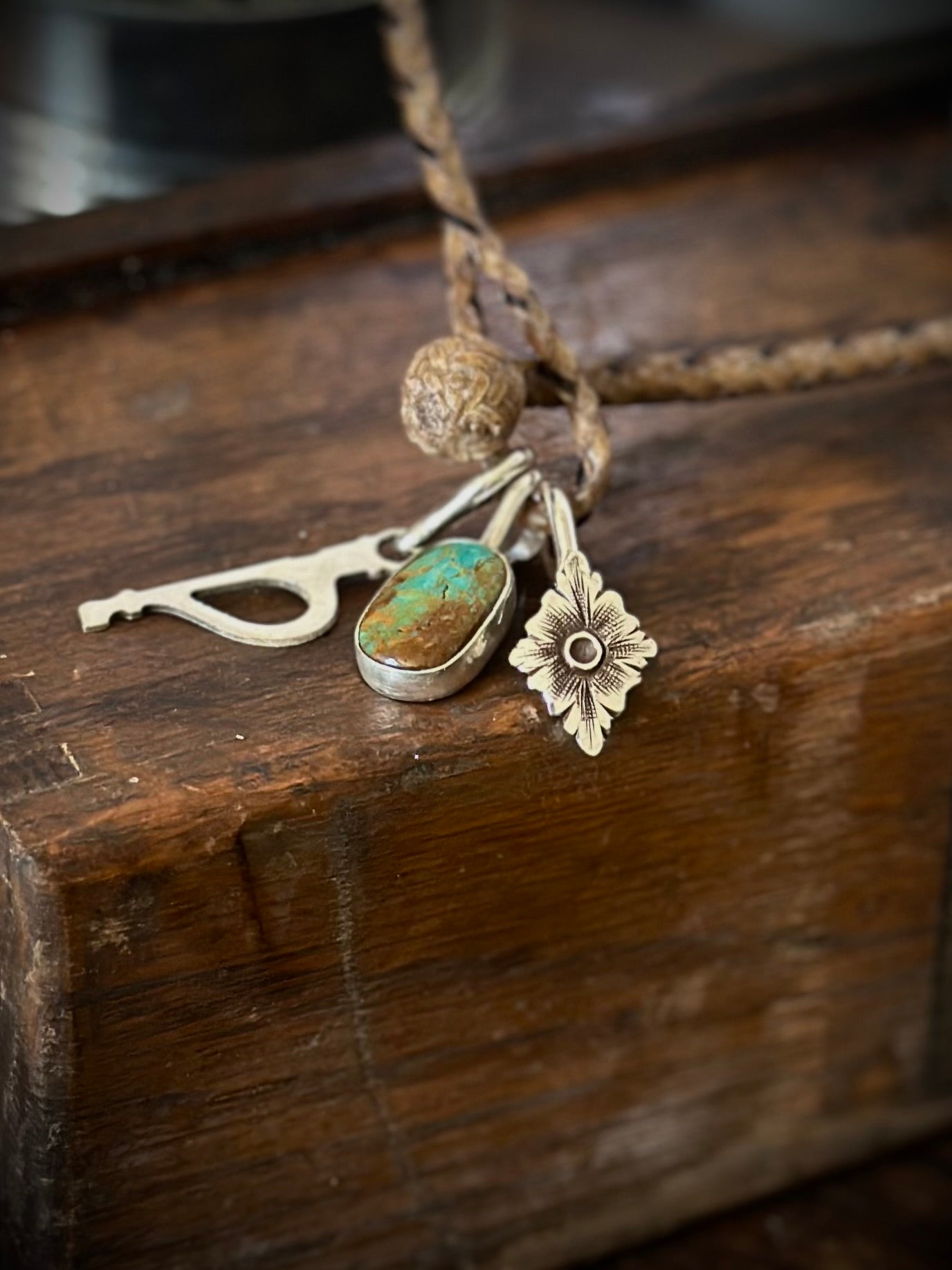 A necklace that carries the spirit of the open range — braided rawhide for the journey, three charms for the stories.