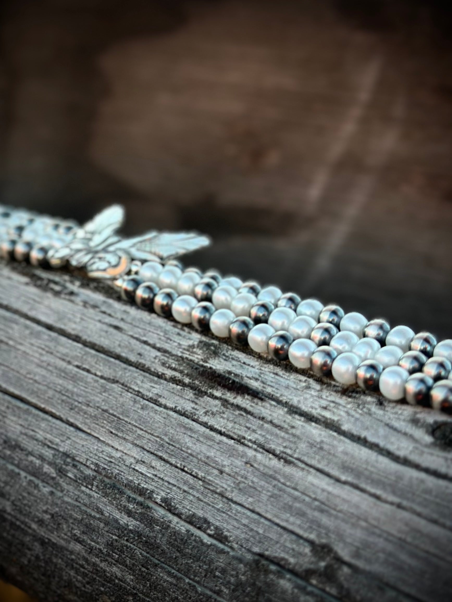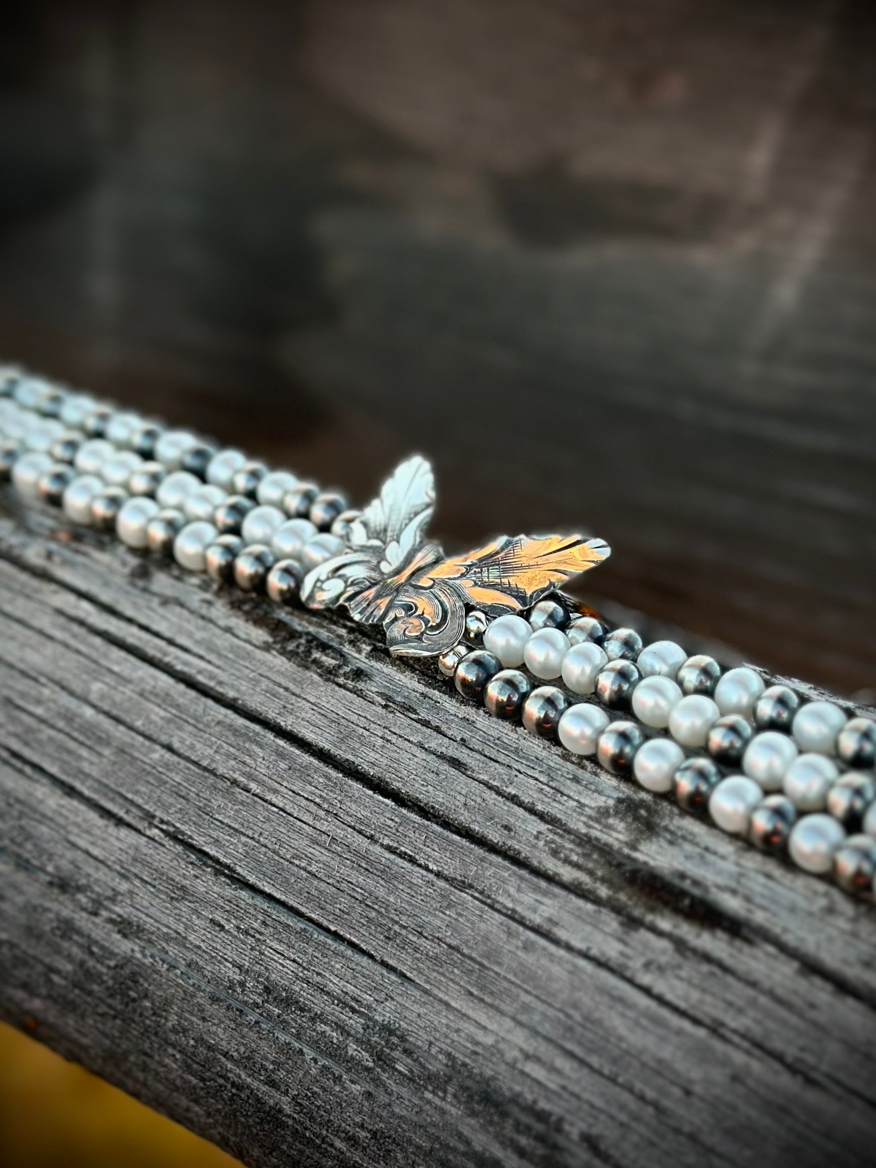 Echoing the romance of a bygone era, this choker pairs luminous Grade A pearls and sterling silver desert pearls with a hand-engraved sterling silver butterfly centerpiece. Each detail reflects Victorian elegance while honoring the artistry of the West—a necklace meant for moments of love, legacy, and transformation.